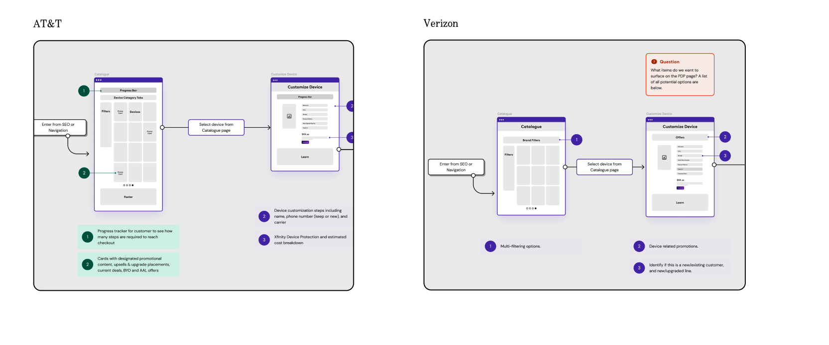 Since this brand new experience would significantly impact our existing pathing for both new and existing customers looking to shop device-led, we decided we needed to map out all entry points and possible user flows. This helped us to understand how these future changes will impact the rest of the site, as well as what updates were necessary to make to existing screens or flows. We created 4 different user flows to map out the experience for both agents, and new, existing, and BYO customers.