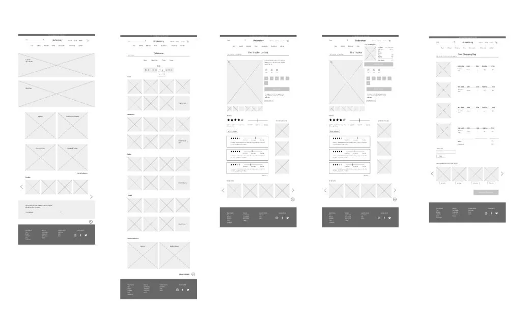 Once the homepage was digitized I then framed out the remaining 5 screens from the primary user flow: category page, product page, product page once an item has been added to the cart, and the shopping bag.
